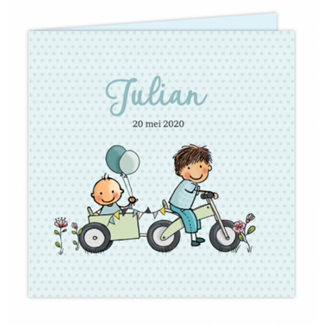 Geboortekaartje 2e kindje van een jongens met ballon met mooi getekende veldbloemen en vogeltje. Je kunt het ontwerp aanpassen naar de gewenste gezinssituatie.