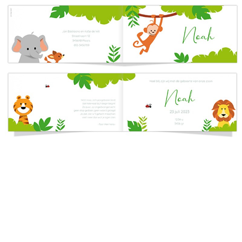 Trendy langwerpig geboortekaartje. Een aapje hangt in de takken. Verder zie je in de binnenkant en op de achterkant een leeuw, tijger, olifant en hertje. Het leuke van dit kaartje is dat je heel makkelijk zelf een ander dier op de voorkant kan zetten. We hebben een zeer uitgebreide databank van dieren waar je uit kan kiezen: leeuw, giraf, olifant, luiaard, tijger, zebra, aap. Schuiven, dupliceren, vergroten of verkleinen: ga zelf creatief aan de slag en maak er je zelfontworpen kaartje van. En met code PK-01 is je eerste proefkaartje gratis!