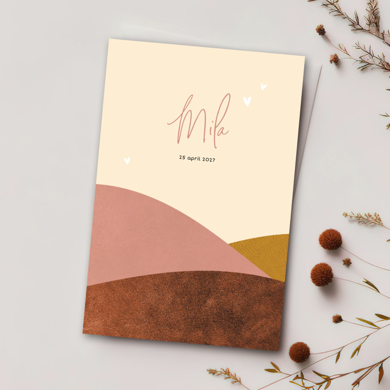 Een trendy geboortekaartje met minimalistische opmaak. Op de voorkant staan abstracte vormen die samen een landschap vormen. De subtiele texturen in de vormen geven dit kaartje wat meer diepte. In de okergele zit bijvoorbeeld een patroon van bladeren. De naam van je pasgeboren dochtertje komt in sierlijke typografie boven het landschap te staan.