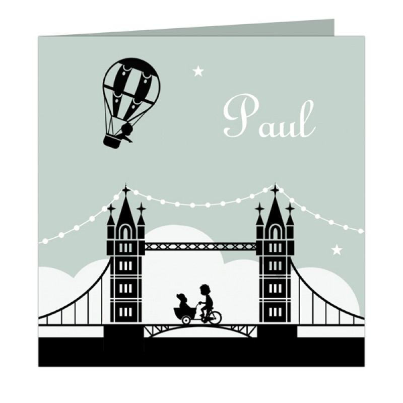 Avontuurlijk geboortekaartje in trendy silhouet-stijl. Een jongetje zweeft in een luchtballon boven Londen en kijkt neer op de Londense Tower Bridge. Op de binnenkant kun je ook de Big Ben zien. Leuk voor als één of beide ouders uit Engeland komt/komen. Kleuren, teksten en ook de afbeeldingen kunnen naar eigen smaak worden aangepast.