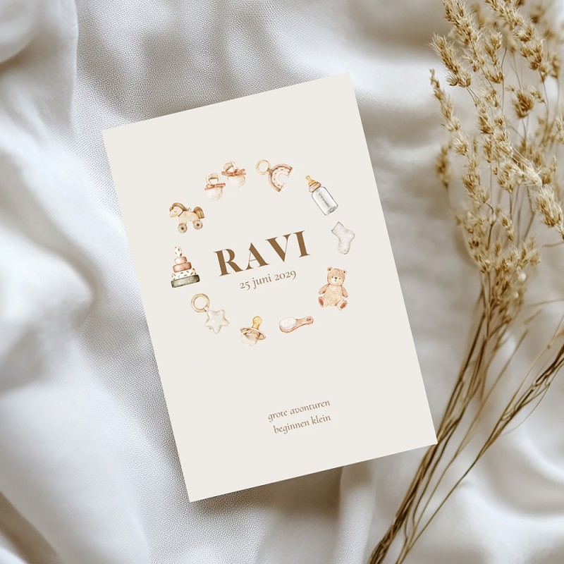Welkom, kleine Ravi! Dit prachtige geboortekaartje straalt warmte en zachtheid uit met de neutrale aardetinten en lieve illustraties van baby speelgoed. In het midden staat de naam van je kindje in klassieke typografie. Rondom de naam zijn fijne aquarel tekeningetjes van o.a. baby speelgoed verwerkt, zoals een knuffelbeertje, een speentje, een rammelaar en een zacht babyflesje. Deze illustraties geven het kaartje een speelse en toch rustige uitstraling – perfect voor de aankondiging van jullie kleine wonder.