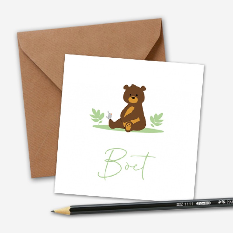 Lief beren-geboortekaartje. Rustig qua vormgeving en daardoor komt het beertje extra goed naar voren.
