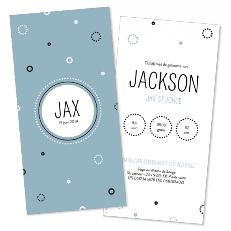 Langwerpig blauw geboortekaartje met verschillende trendy cirkels. In de grote cirkel op de voorkant kun je de naam van je kindje zetten. Pas de blauwe kleur eventueel aan naar een andere kleur.