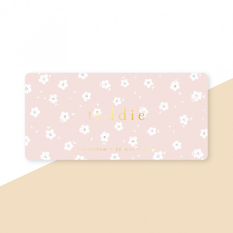 Langwerpig liggend geboortekaartje met kleine witte ronde bloemen, goudfolie en ronde hoeken. Je kunt de kleur van het geboortekaartje, de tekst en het lettertype gemakkelijk naar wens aanpassen en er een mooi persoonlijk geboortekaartje van maken. LET OP! Deze kaart heeft een langere levertijd: op werkdagen voor 18.00 uur besteld is de volgende werkdag gedrukt en verzonden.