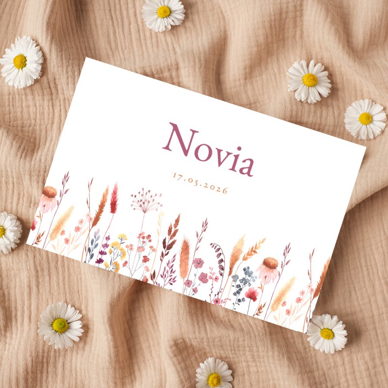 Geboortekaartje voor de geboorte van een meisje met waterverf gedroogde bloemen in roze tinten als roze, rood en oranje. Dit mooie geboortekaartje heeft een botanische stijl. Op voorzijde zie je verschillende soorten bloemen en planten in een zachtroze kleuren. Aan de binnenkant van de kaart komen de droogbloemen terug en hier kan je alle gegevens van jullie kleine meid kwijt.