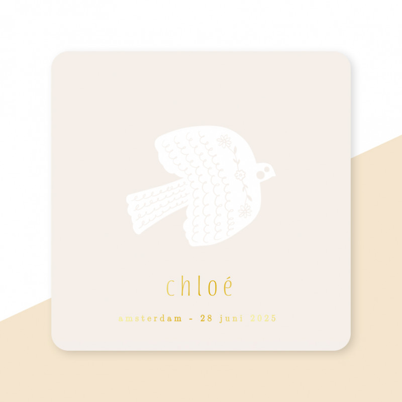 Vierkant geboortekaartje met een vogel en goudfolie. Pas de achtergrondkleur, het lettertype en de foliekleur eenvoudig aan in de editor. Wil je het geboortekaartje liever als een dubbel kaartje of in een ander formaat, neem dan gerust contact op! LET OP! Deze kaart heeft een langere levertijd: op werkdagen voor 18.00 uur besteld is de volgende werkdag gedrukt en verzonden.