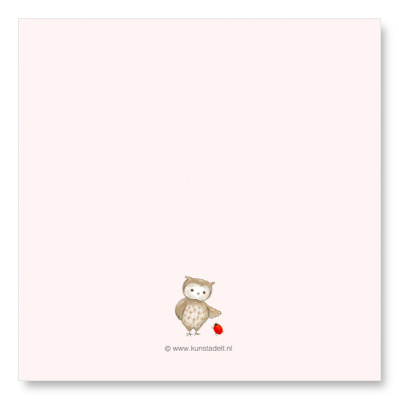 Lief geboortekaartje met de afbeelding van verschillende bosdieren als een hertje, konijn, egel, lieveheersbeestje, uil en eekhoorn voor een krans op een zachtroze achtergrond. Aan de binnenzijde staat dezelfde krans met de uil en het konijntje en rechts het lieveheersbeestje naast de naam. De achtergrondkleur, de afbeeldingen en tekst zijn naar wens in grootte en kleur aan te passen.