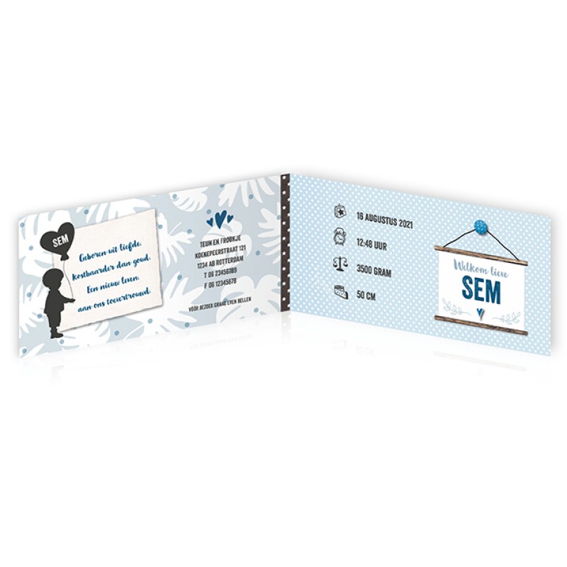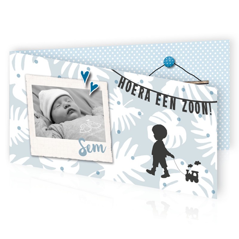 Geboortekaartje met blauwgrijze bladeren print, een foto en een jongetje met speeltje. Pas het kaartje naar wens aan met onze handige ontwerptool.