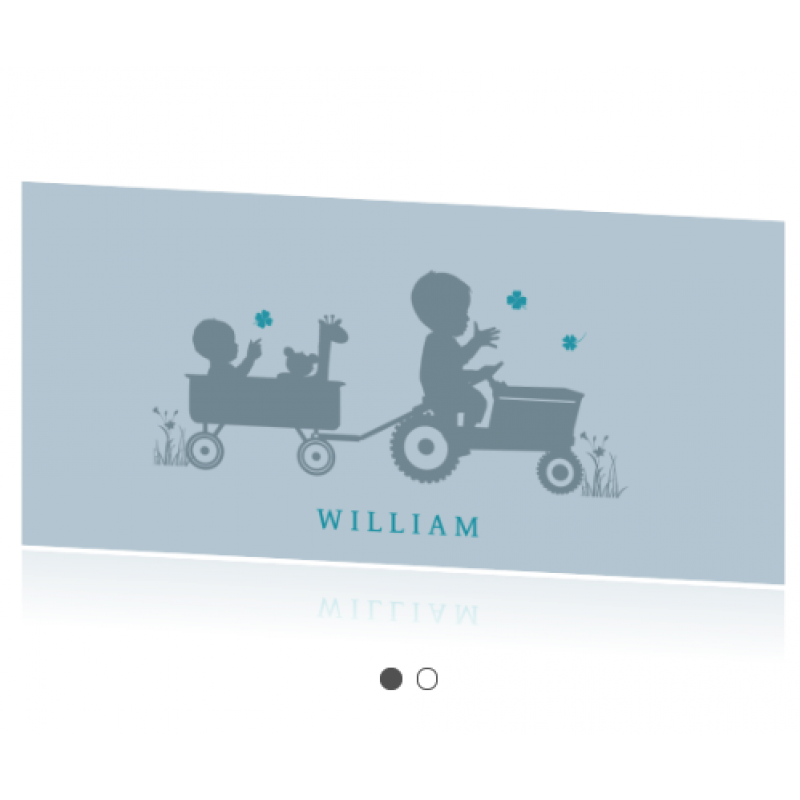 Langwerpige liggende kaart van stoer broertje op tractor met broertje in bakje met giraf en beer.