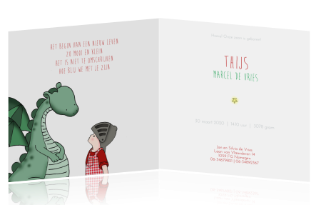 Dit handgetekende geboortekaartje van een dinosaurus en klein riddertje is erg aandoenlijk. Volgens mij willen ze alleen maar vriendjes zijn. Te bestellen voor een jongen en meisje. Bestel een gratis proefdruk met kortingscode 'gratisproef2017' op https://mycards.nl