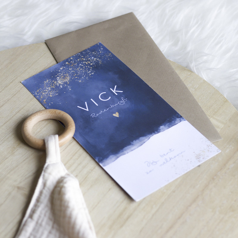 Op zoek naar het mooiste geboortekaartje voor je pasgeboren zoontje? Als je van chique ontwerpen houdt, dan is dit het ontwerp voor jou. De kaart heeft een donkere voorzijde geschilderd met donkerblauwe waterverf en is versierd met speelse spetters. Met een strak lettertype staat de naam op de voorzijde. In de ontwerptool maak je het kaartje helemaal naar wens.