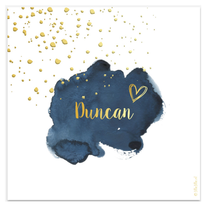 Hoera! Duncan is geboren! Stijlvolle goudfolie geboortekaart voor jongetje met aquarel en goud- of koper of zilver kleurige spetters confetti en hartjes. Pas zelf eenvoudig de teksten aan op deze stijlvolle kaart. Een proefdrukje met de papierstalen kost maar €1,- , wij drukken 6 dagen in de week bij JilleJille.nl en verzenden is gratis!