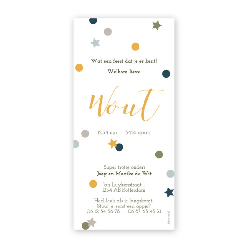 Vrolijk geboortekaartje met confetti, sterretjes en een echt houten sterretje. Wil je het kaartje liever in andere kleuren? Je kunt de confetti gemakkelijk een andere kleur geven in de editor.