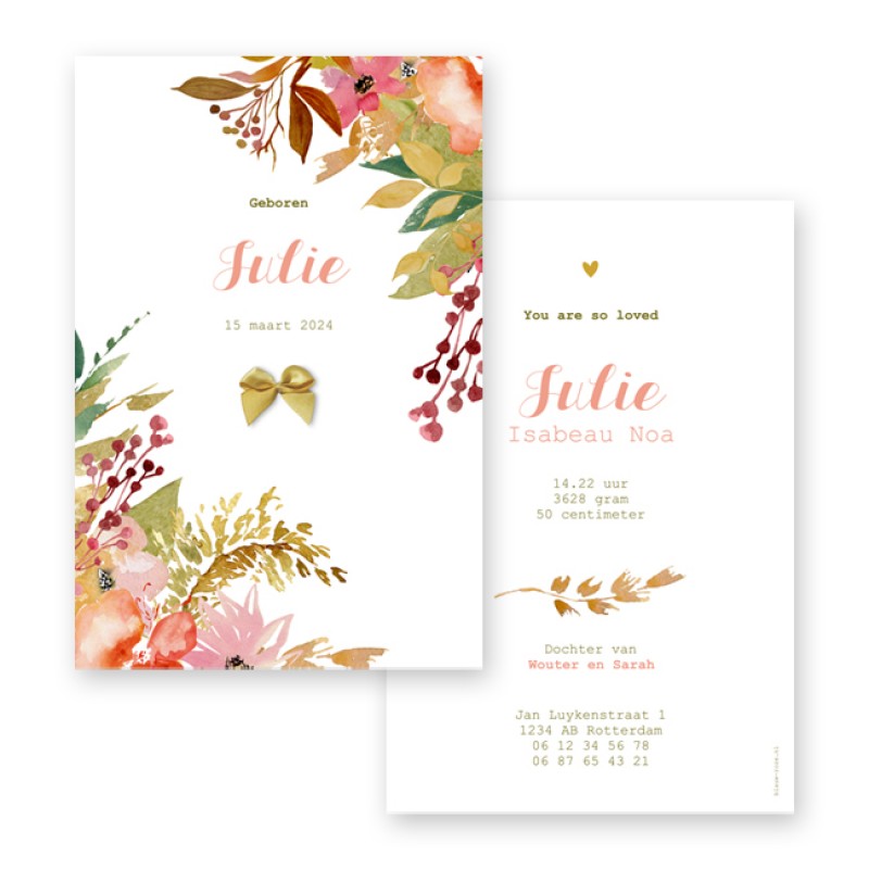 Botanisch watercolor geboortekaartje met een echt gouden satijnen strikje voor een meisje. In de editor kun je het geboortekaartje gemakkelijk aanpassen naar je eigen wensen.