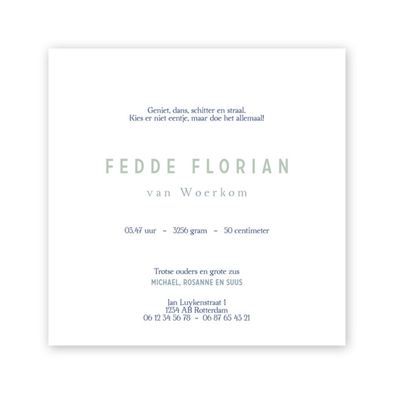 Vierkant watercolor geboortekaartje met een echt olijfgroenen satijnen strikje voor een jongen. In de editor kun je het geboortekaartje gemakkelijk aanpassen naar je eigen wensen.