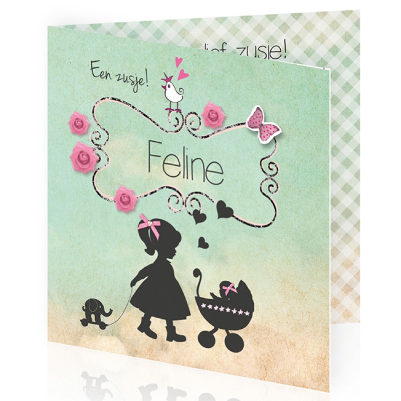 Mooi geboortekaartje voor een de geboorte van een zusje. Pas het geboortekaartje geheel naar eigen wens aan met onze handige online ontwerptool. Bestel dan ook een gratis proefkaartje met de code GPHAPPY. Vind je het fijner om persoonlijk geholpen te worden? Ons team staat altijd gratis voor jullie klaar.