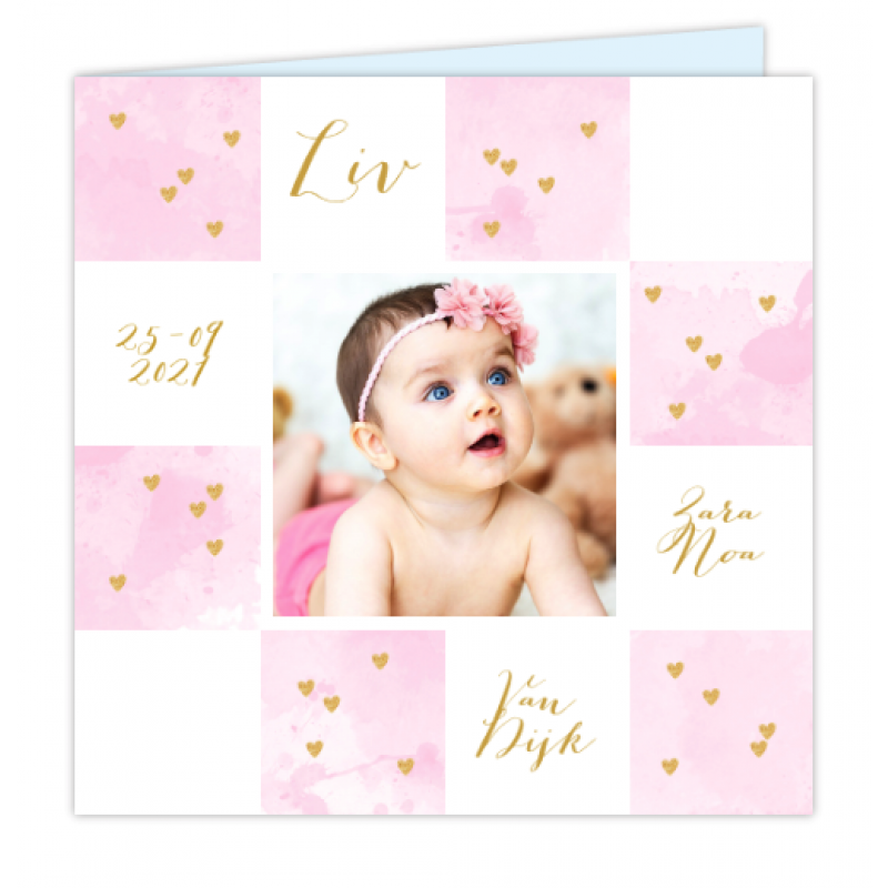Een lief en hip geboortekaartje voor een meisje met foto, aquarel en hartjes. Vervang zelf de foto en pas de teksten aan.
