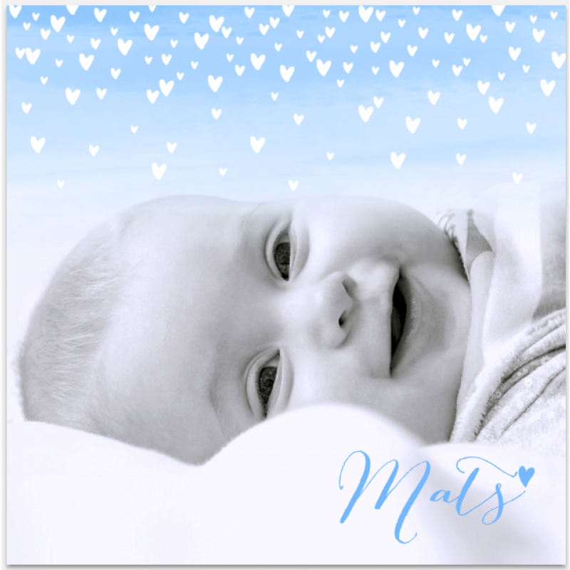 Een lief geboortekaartje met foto, hartjes en blauwe aquarel achtergrond.