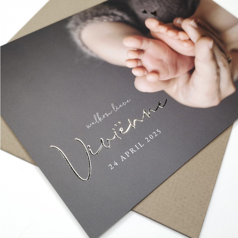 Heb jij een mooie foto laten maken van je pasgeboren zoontje? Hoe leuk is het dan om deze op zijn geboortekaartje te plaatsen. Dit stijlvolle ontwerp leent zich daar perfect voor. De kaart wordt gedrukt met de naam en de hartjes op de voorzijde in goudfolie. Op de achterzijde kun je onder de icoontjes de geboortegegevens plaatsen.