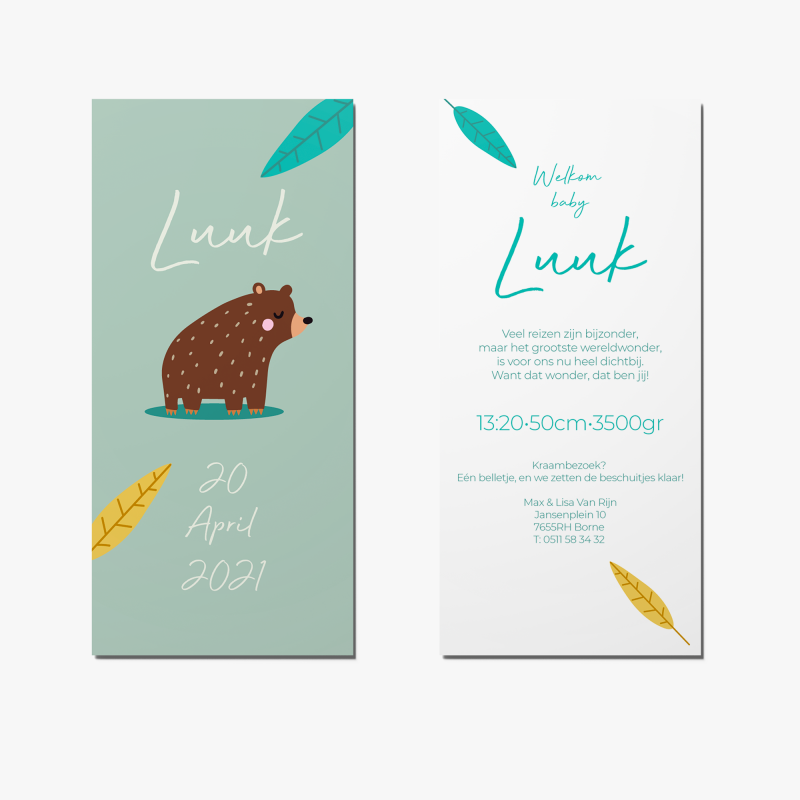 Dit geboortekaartje heeft op de voorkant een beer en bladeren op de voor en achterkant.