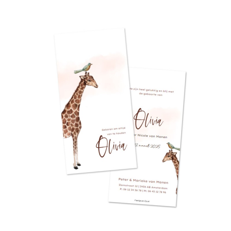 Enkel staand geboortekaartje met een handgetekende illustratie van een giraffe. Op de kop staat een vogeltje. Origineel kaartje met op de achtergrond heel licht roze waterverf.