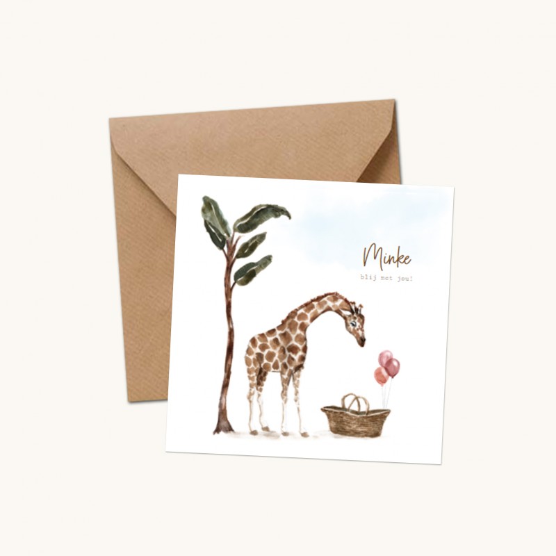 Wat een lief geboortekaartje is dit. Met handgetekende illustraties van een giraf bij een babymandje. Daarachter een boom en bij het wiegje hangen nog roze ballonnen. Alle illustraties op dit kaartje kan je zelf aanpassen.