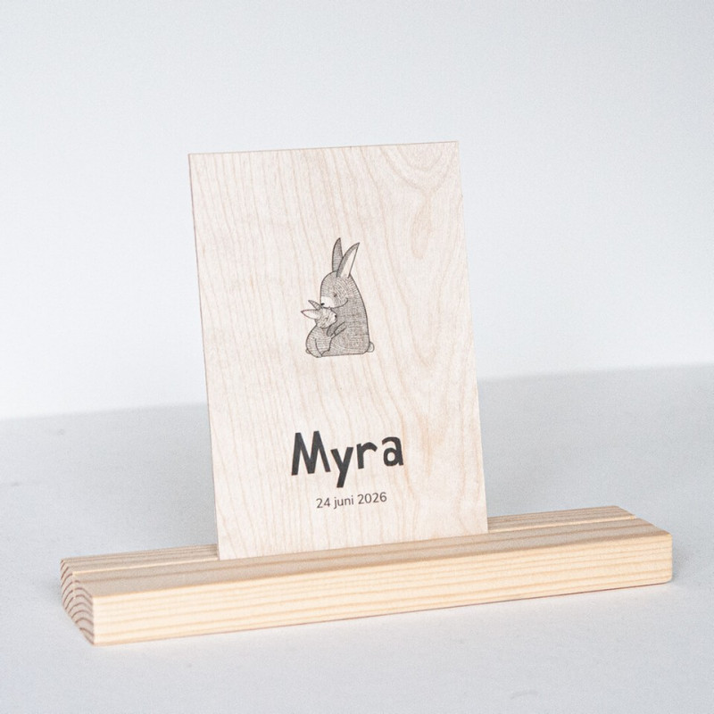 Schattige gestyleerde konijntjes op jouw geboortekaartje? Twee knuffelende konijntjes staan centraal op dit mooie berkenhouten geboortekaartje.