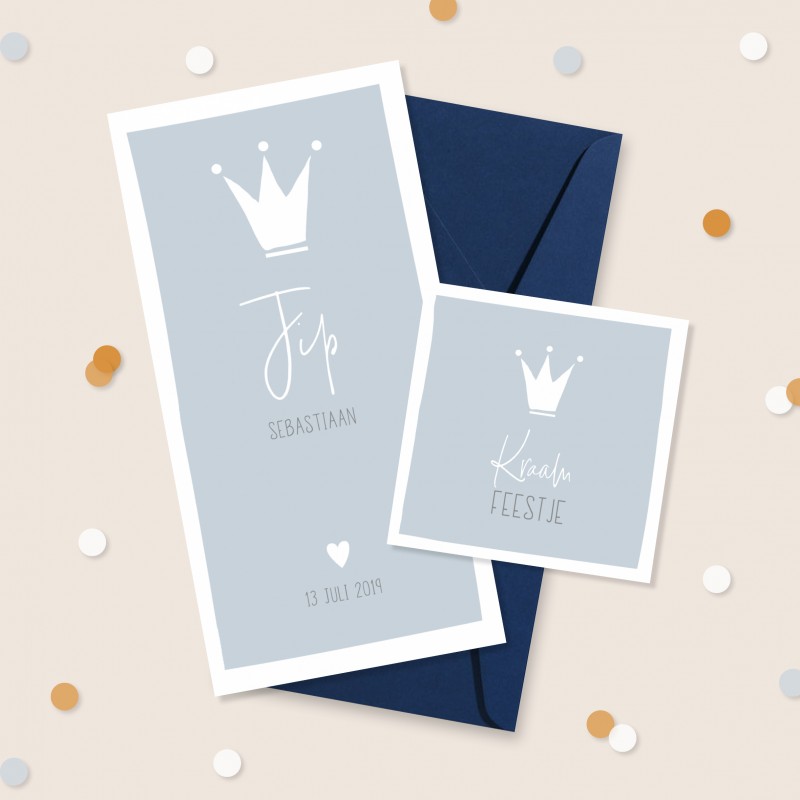 Vandaag is het prinsjesdag! Hip langwerpig geboortekaartje voor de geboorte van een jongen met een illustratie van een kroon en een hartje.