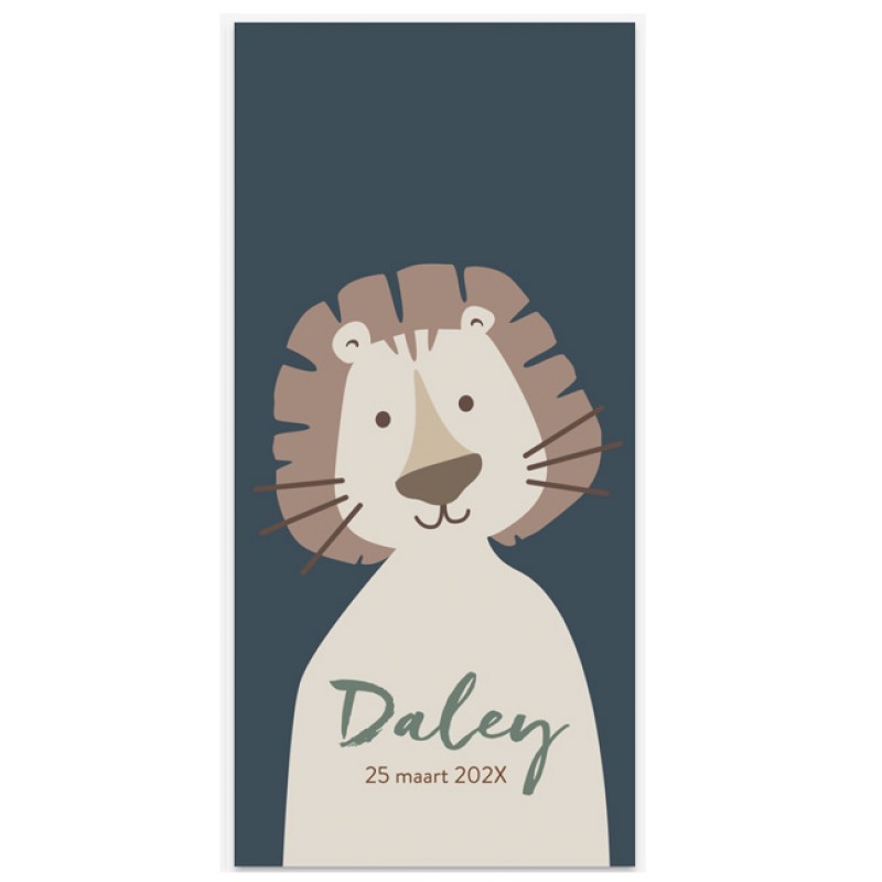 Hippe geboortekaart met schattig leeuwtje om eenvoudig zelf te maken. Verander de achtergrondkleur de teksten en het lettertype naar eigen wens. Een proefdrukje met alle kleur- en papierstalen heb je al in huis voor maar €1,-