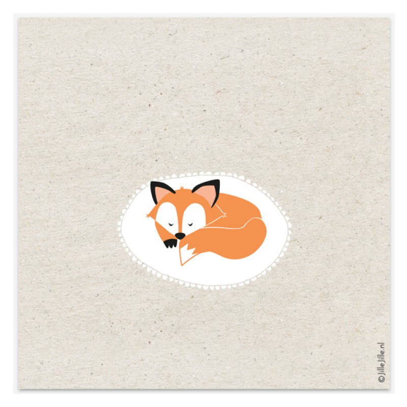 Lief geboortekaartje met schattig vosje op een kleedje op een kraft achtergrond. Een proefdrukje met de papierstalen kost maar €1,- bij JilleJille.nl en verzenden is gratis!