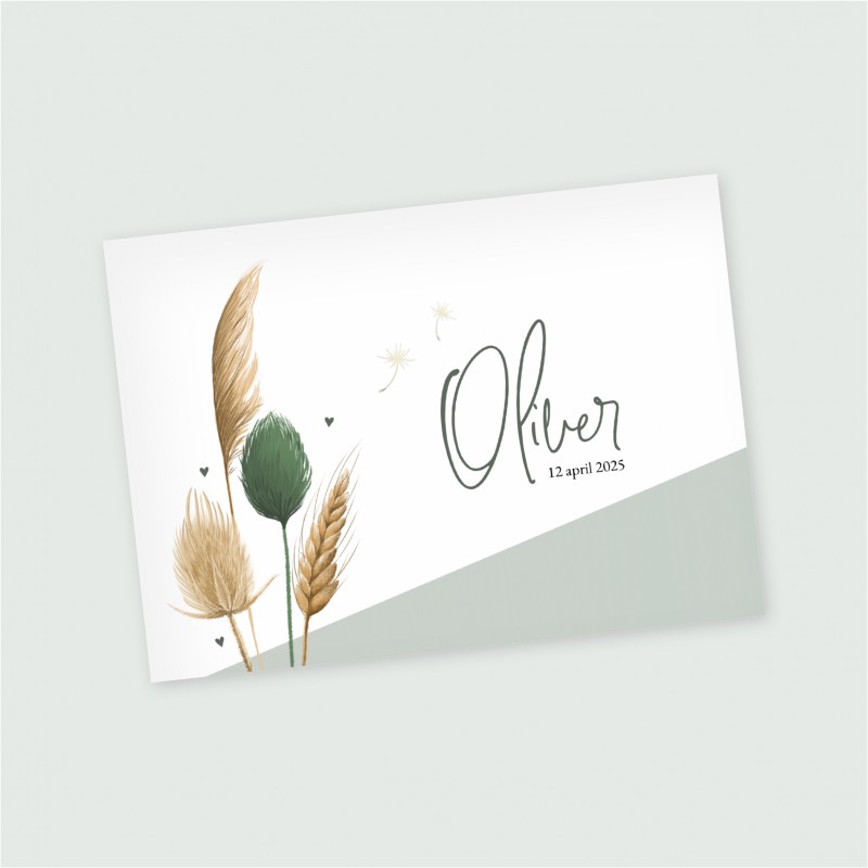 Lief geboortekaartje met geometrisch groen vlak. Dit liggende ontwerp is helemaal van nu door het gebruik van prachtige droogbloemen in de kleuren beige en groen. Met een vrolijk lettertype staat de naam van je zoontje voorop. Op de achterzijde keren de droogbloemen en het pampasgras terug. Pas het ontwerp gemakkelijk aan in onze handige designtool.