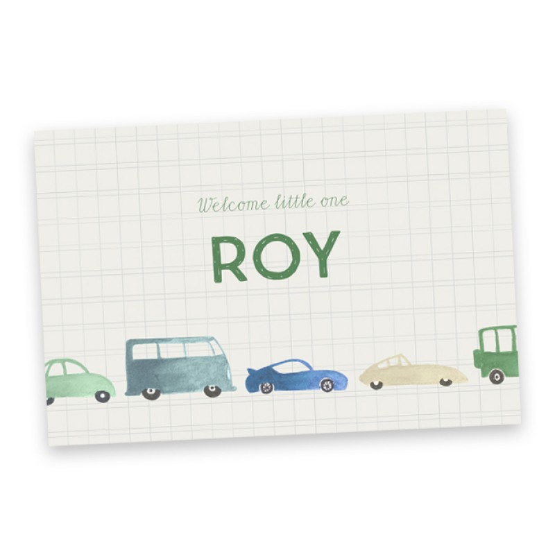 Hip geboortekaartje met watercolor auto's en in de achtergrond een grid. Pas de tekst aan en maak er jullie eigen ontwerp van.