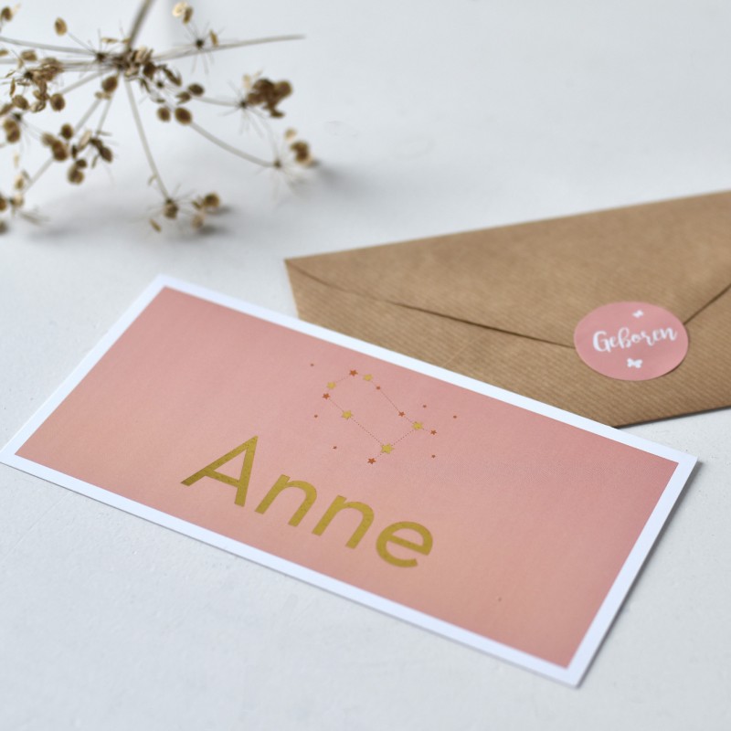 Een warm gouden sterrenbeeld op een mooie stevige geboortekaart. Dit kaartje heeft digitale goudfolie en en warme zachte kleur. De kleuren zijn zelf aan te passen evenals de illustraties. Geef zelf aan wat je in de goudfolie wilt en zilverfolie of koperfolie kan ook.
