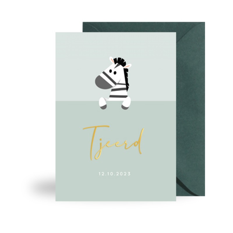 Mooi enkel geboortekaartje met een zebra dat over een verhoging kijkt. In goudfolie staat de naam van de pasgeboren baby. Dit kaartje is leuk voor zowel een jongen als een meisje!