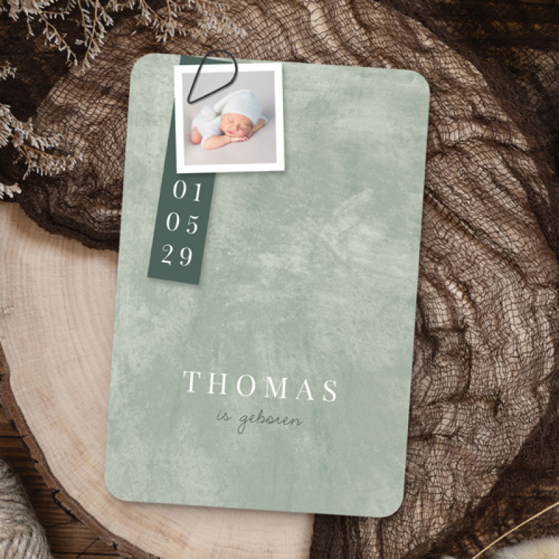 Lief zachtgroen geboortekaartje met klassieke typografie en ruimte voor labeltjes. Met een labeltje met foto van je pasgeboren zoontje wordt het versturen van het geboortekaartje nog persoonlijker! Pas de kaart en de labels zelf naar wens aan in onze handige editor.