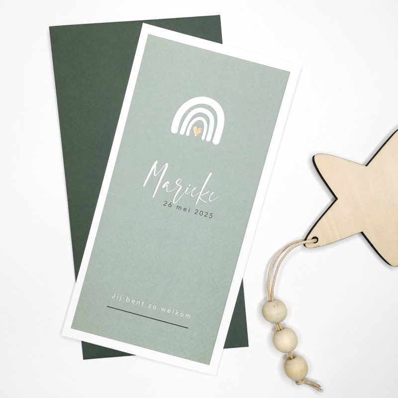 Wil jij een trendy toch stijlvol geboortekaartje? Dan is dit ontwerp met groene achtergrond en wit kader wat voor jou. Op de voorzijde van dit mooie kaartje staat een wit regenboogje met een goudkleurig hartje. De eenvoud geeft het kaartje een stijlvolle uitstraling. Met een sierlijk, speels lettertype staat de naam van je zoontje voorop de kaart.