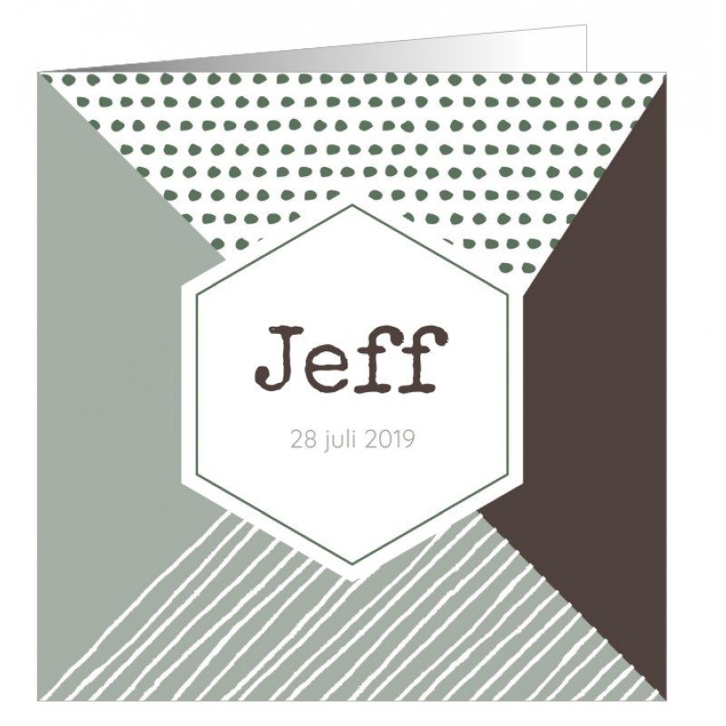 Geboortekaartje volgens de laatste trend met geometrische vormen, stippen en streepjes. Op de voorkant staat een witte zeshoek waarin je de naam van je kindje kunt plaatsen.