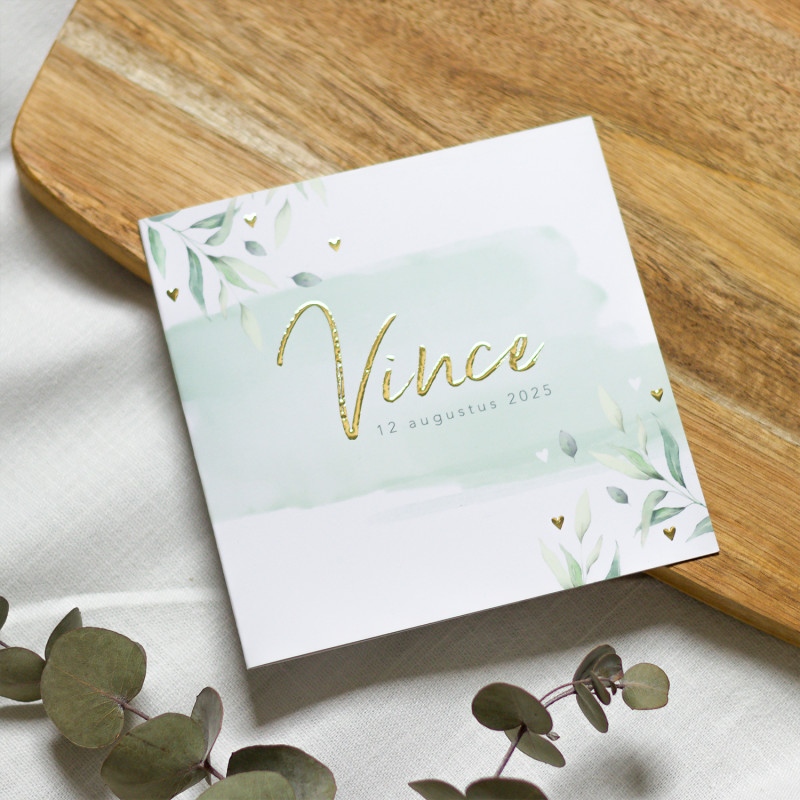 Stijlvol geboortekaartje met mooie groene waterverf. De subtiele bladeren geven de kaart een botanisch tintje. Op de voorkant wordt de naam van jullie pasgeboren zoontje met goudfolie gedrukt, hierdoor wordt het kaartje net even iets specialer. Benieuwd naar dit ontwerp, bestel een gepersonaliseerde drukproef.