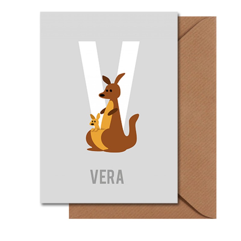 Origineel enkel geboortekaartje met een kangoeroe met in haar buidel een kleine kangoeroe. Op de achtergrond staat een grote letter V, de eerste letter van de voornaam van de baby. Ga jij in je eentje je baby opvoeden? Dan is dit echt een kaartje voor jou!