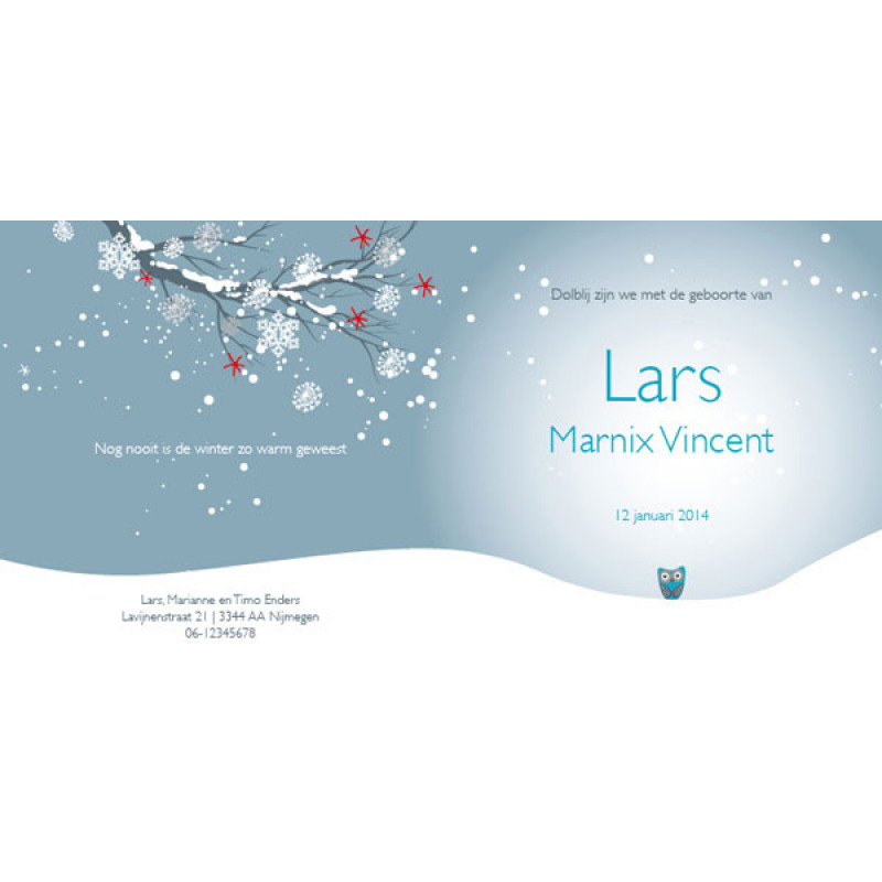 Nog nooit was de winter zo warm! Sfeervol lief winters geboortekaartje met prachtige rustige blauwe tinten. De gezinssamenstelling van de uiltjes kan uiteraard naar wens worden aangepast.