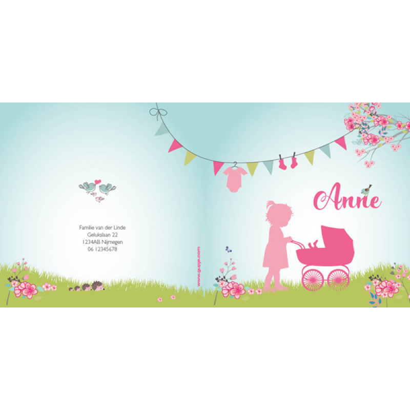 Wat een super lief geboortekaartje is dit voor jullie dochtertje. Het kaartje is nu als voorbeeld gemaakt met silhouetjes van een zusje maar dat kan natuurlijk worden zoals jullie gezinssamenstelling is. Dus het kan ook met broer en zus of twee broertjes of 1 zusje of 1 broertje, noem maar op. Als silhouetjes kunnen er ook eigen diertjes bij indien gewenst. Kleuren kunnen altijd aangepast worden.