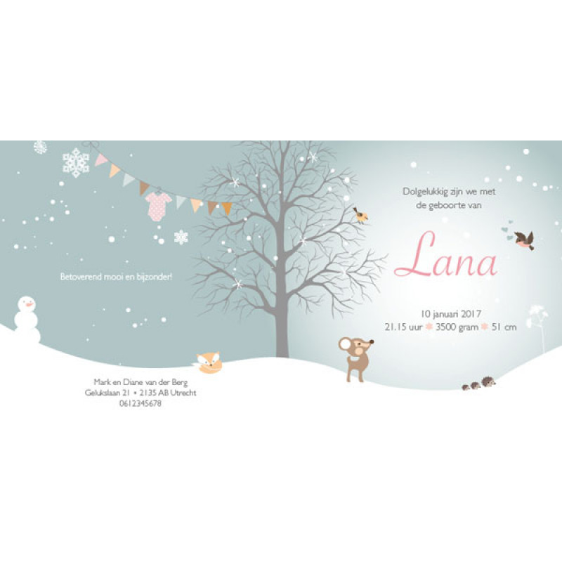 Dit pastelkleurige winterkaartje is super lief, rustig en stijlvol. Er zijn prachtige poederkleuren gebruikt en in het warme winterse landschap staan en vliegen diverse diertjes. Alle geboortekaartjes kunnen naar wens worden aangepast. Denk aan broertje(s) en of zusjes(s) erbij, jullie huisdier, andere kleuren, mixen met andere kaartjes, ander lettertype, ander formaat. Alles is mogelijk en alle eigen wensen zijn altijd gratis. tijdens het bestellen kunnen eigen wensen worden ingevuld. Gupje maakt jullie kaartje binnen 3-5 werkdagen en mailt het kaartje naar jullie. Correcties kunnen dan altijd nog en zijn gratis.