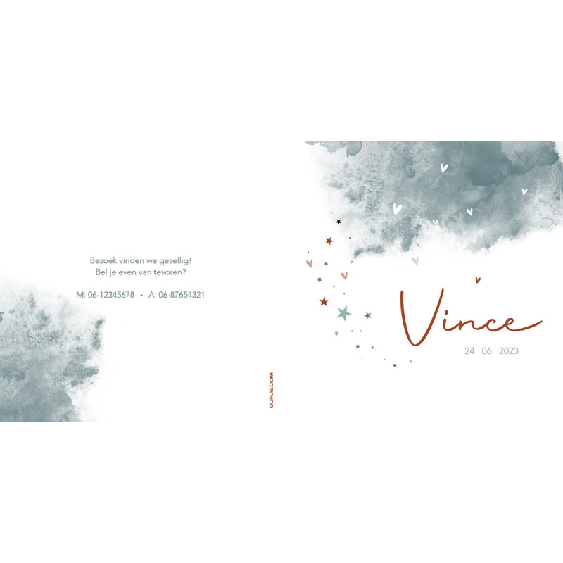 Zijn jullie ook zo fan van koper en prachtig oudblauwe tinten? Dit kaartje heeft een aquarel 'wolk' waar hartjes uitvallen en sterretjes. Het kaartje is qua kleur al prachtig zo maar wil je andere kleuren dan kan dat. Dit kaartje, maar dan met ECHT koperfolie? Dan kan ook. Meerprijs is dan 1,- per kaartje