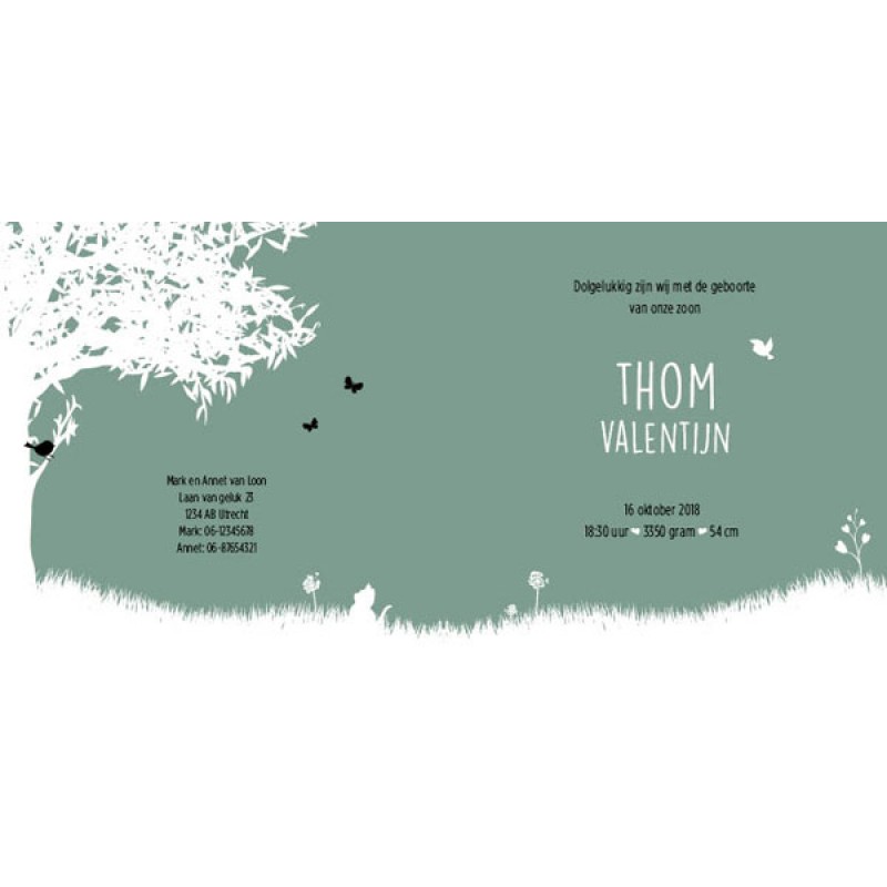 Hip en strak geboortekaartje in het 'oud' groen met witte boom en zwarte details. Super lief met silhouetje van jongetje die pluisjes van een blaasbloem wegblaast. Het kaartje wordt gedrukt op mooi relif papier. Uiteraard kan het silhouetje ook een wiegje worden of een zusje/broertje die een kinderwagen duwt of kindjes op een bakfiets....net wat jullie willen!