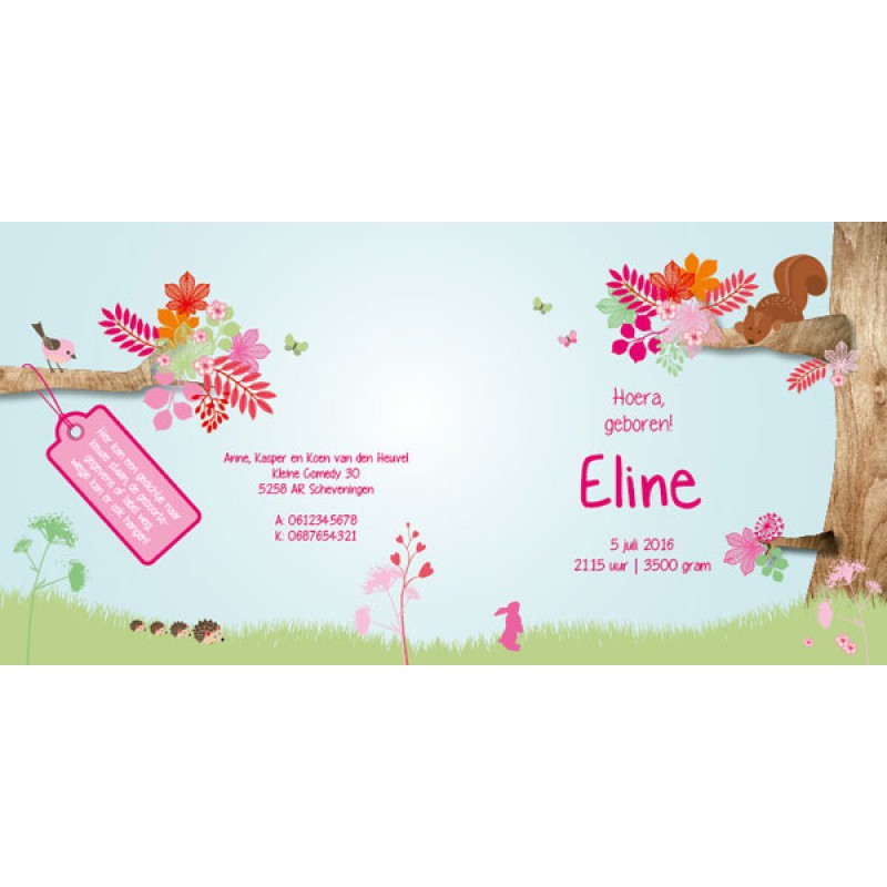 WWat een vrolijk geboortekaartje is dit voor jullie tweede kindje! Er staat een roze silhouet van zusje naast het wiegje. In het wiegje kunnen ook voetjes komen. En het zusje kan natuurlijk weg als het jullie eerste kindje is of het kan een broertje worden. Er staan diverse diertjes op het kaartje zoals hertje, egeltjes, vogeltjes, eekhoorntje en konijntjes. De kleuren zijn fuchsia, roze, mintgroen en oranje.