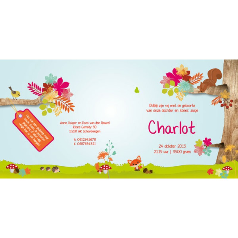 Ooohw wat een lief geboortekaartje met herfstig landschap in oranje, groen en roze tinten en schattige vosjes. Aan de boom hangt een wiegje waaruit de voetjes komen van jullie pasgeboren baby. Dit kaartje is ook mooi met silhouetjes van broertjes of zusjes. Alle geboortekaartjes kunnen naar wens worden aangepast. Denk aan broertje(s) en of zusjes(s) erbij, jullie huisdier, andere kleuren, mixen met andere kaartjes, ander lettertype, ander formaat. Alles is mogelijk en alle eigen wensen zijn altijd gratis. tijdens het bestellen kunnen eigen wensen worden ingevuld. Gupje maakt jullie kaartje binnen 3-5 werkdagen en mailt het kaartje naar jullie. Correcties kunnen dan altijd nog en zijn gratis.