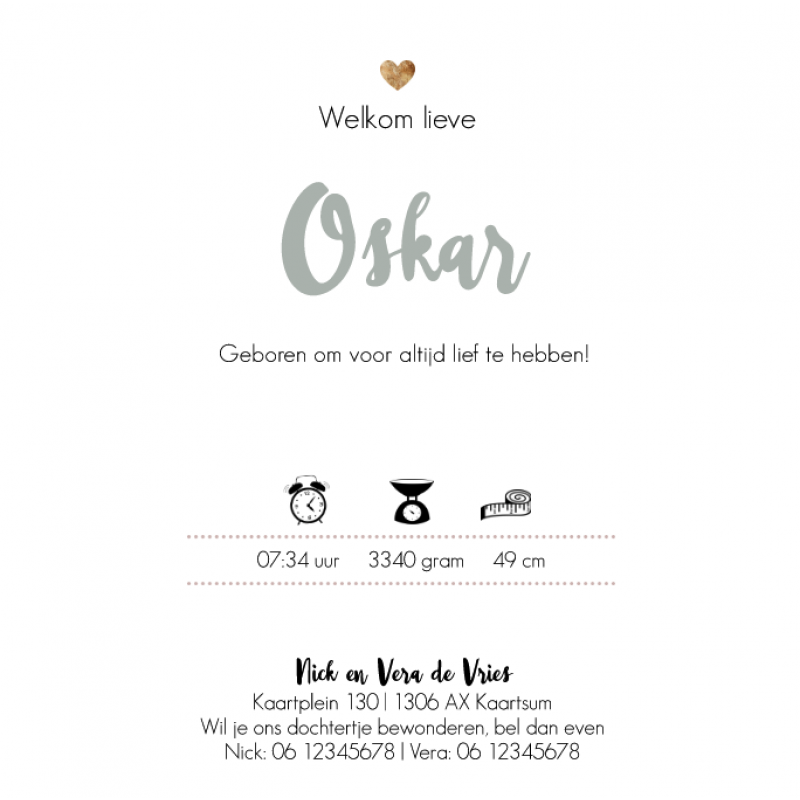 Geboortekaartje jongen confetti en goudlook hartjes.