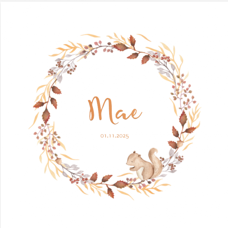 Lief geboortekaartje met koperfolie, schattige eekhoorn en krans van herfstbladeren.