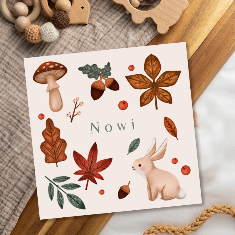 Lief geboortekaartje voor een herfstkindje! Op dit vierkante kaartje staat een klein konijntje met allerlei herfstige elementen: paddenstoeltjes, blaadjes en eikeltjes. De naam van je zoon of dochter komt in eenvoudige groene letters tussen de sfeervolle tekeningen. Aan de binnenzijde is ruimte voor alle geboortegegevens van je kindje. Pas dit kaartje zelf aan in onze ontwerptool en bestel een drukproef.