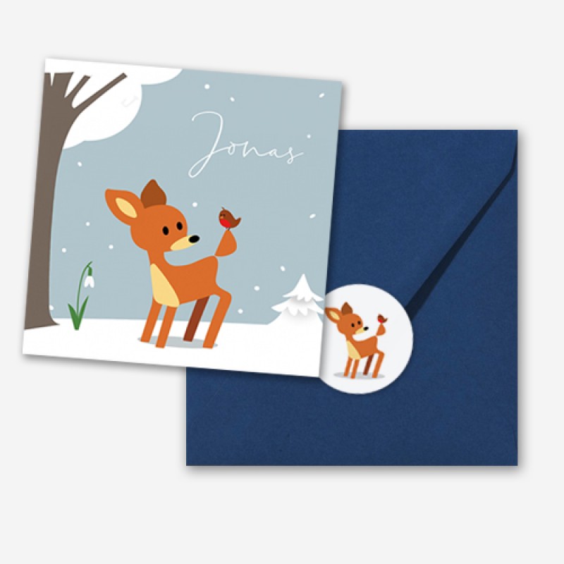 Lief winters geboortekaartje met een hertje dat in de sneeuw naar een vogeltje kijkt dat op zijn staart zit. Maak deze kaart helemaal af door er kraft enveloppen en bijpassende sluitstickers bij te bestellen. En met code PK-01 is je eerste proefkaartje gratis!